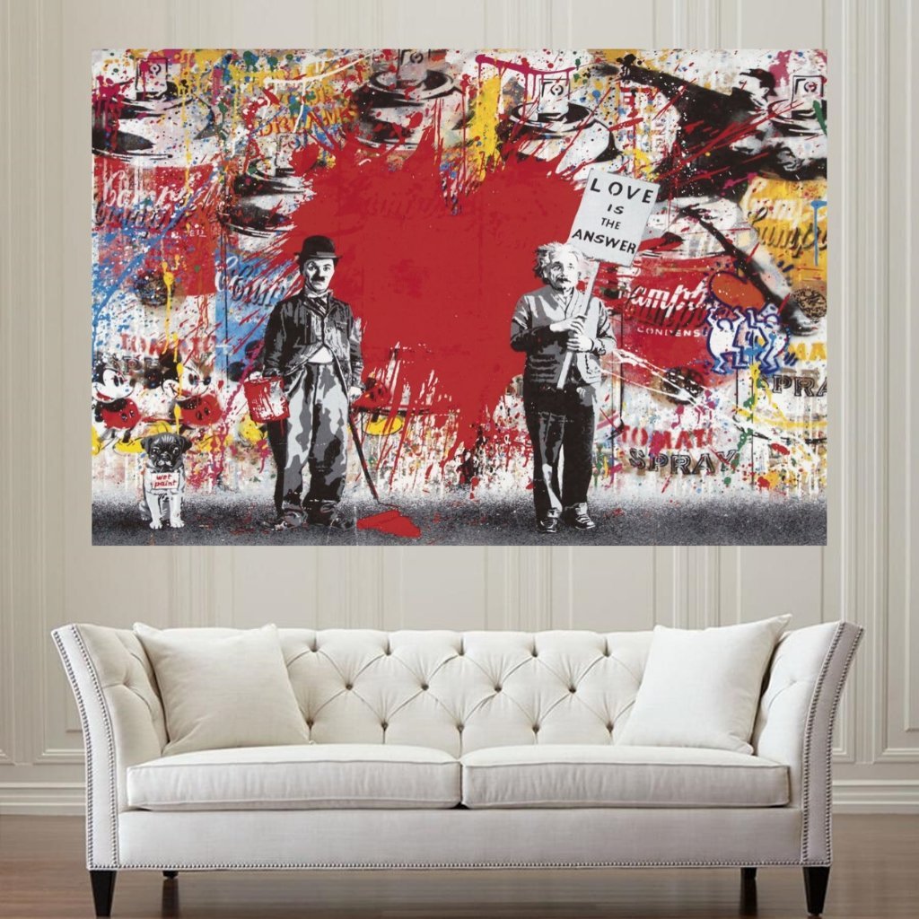Das Banksy "Love is the Answer" Einstein Graffiti Motiv taucht überall in New York auf. Auf unserem Motiv wird Einstein mit Charlie Chaplin an einer bunten Graffiti Wand mit Herz gezeigt. Einstein hält ein Plakat mit der Aufschrift "Love is the Answer".
