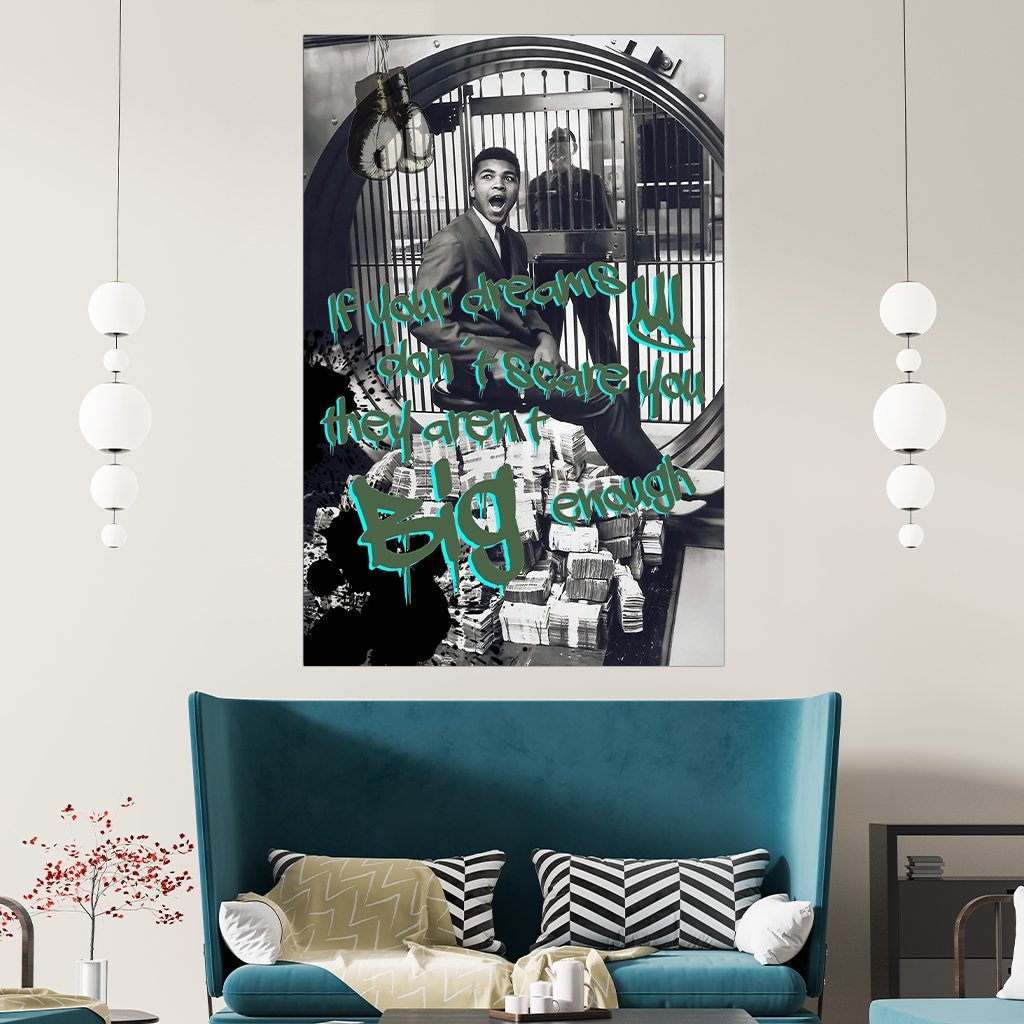 Das Motiv zeigt eine Szene in Schwarz-Weiß, in der Ali, in einem Banktresor voller Geld sitzt. Mit freudigem Ausdruck nimmt er auf den Geldscheinen Platz und lässt seinen Blick über die Scheine schweifen. Im vorderen Teil des Motivs befindet sich der Text: "If your dreams don't scare you, they aren't big enough" (Wenn deine Träume dich nicht erschrecken, sind sie nicht groß genug). Der Text verleiht dem Motiv eine inspirierende und motivierende Note, indem er den Betrachter dazu ermutigt, mutig zu träumen und große Ziele zu verfolgen.