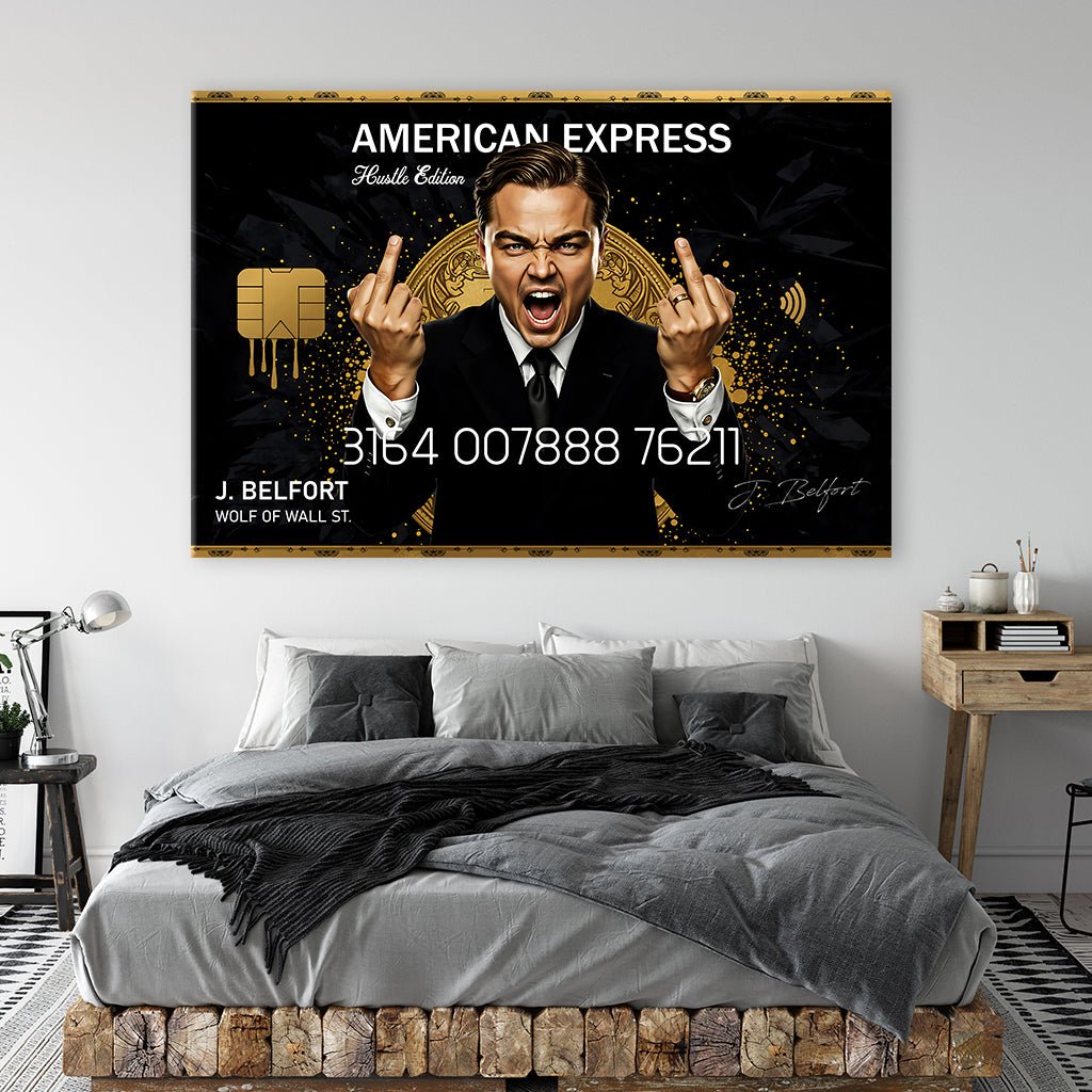 Dieses Kunstwerk zeigt "Jordan Belfort", den Wolf der Wall Street, auf der American Express Black Card. Die Darstellung ist provokativ und zeigt eine Haltung von Macht und Reichtum.