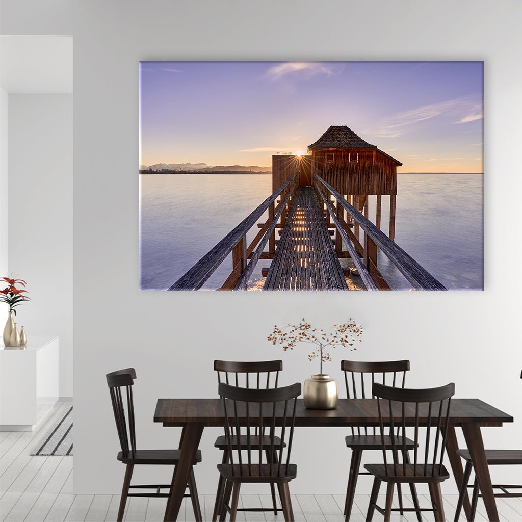 Ein Anleger der ein Stück in den Bodensee hinein ragt mit einem kleinen Holzhäuschen das im Sonnenaufgang und dem Morgennebel über dem See beruhigend und beständig wirkt.