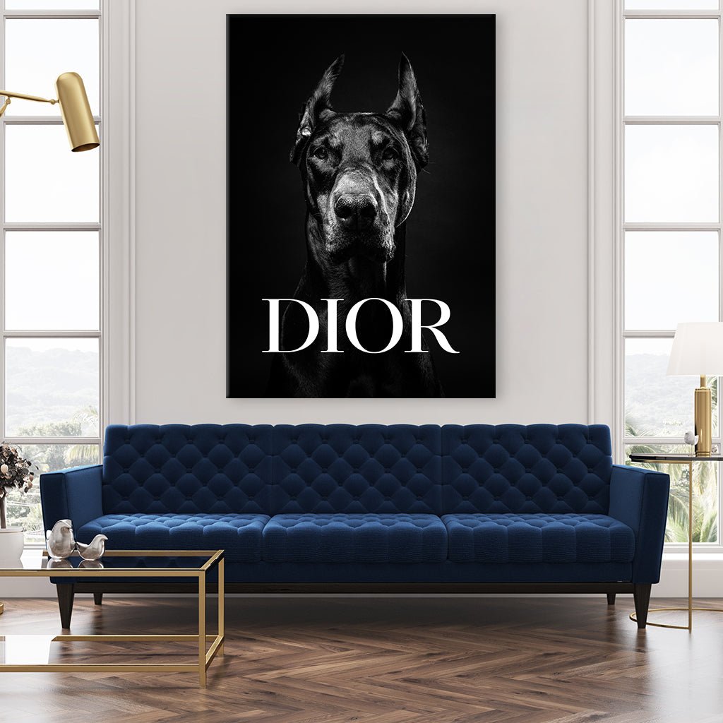 Ein eindrucksvolles Schwarz-Weiß-Foto zeigt einen Dobermann in Nahaufnahme. Im unteren Bildbereich prangt groß der Schriftzug "DIOR". Diese Kombination aus dem eleganten Hund und der renommierten Marke strahlt zeitlose Raffinesse und Stil aus. Ein Bild, das die Schönheit der Tierwelt mit dem Glamour der Mode verbindet.