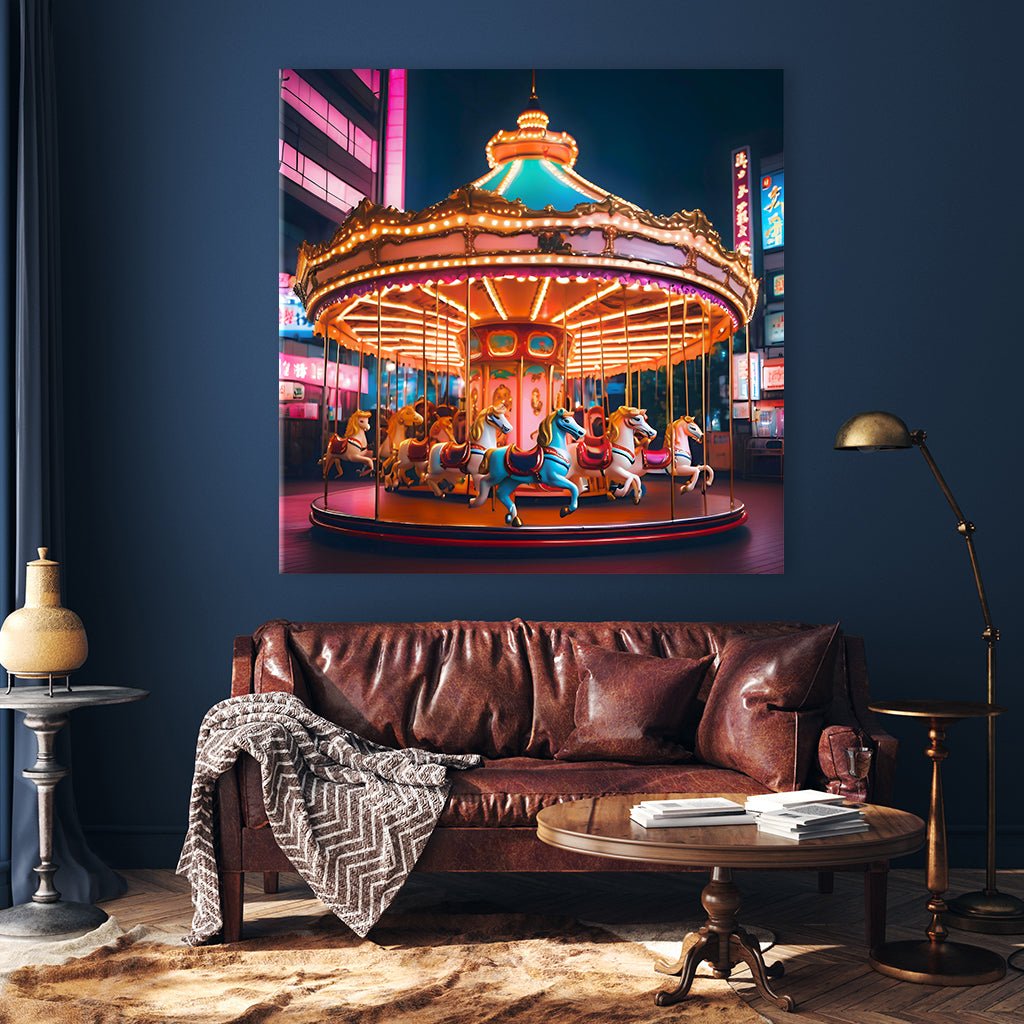 Inmitten der nächtlichen Innenstadt steht ein bunt beleuchtetes Karussell, das im Mittelpunkt des Motivs erstrahlt. Die Karussellpferdchen, liebevoll gestaltet und in lebendigen Farben bemalt, leuchten im Licht der zahlreichen Lampen, die das Karussell umrunden. Die Lichter werfen einen warmen, einladenden Schein auf die umgebenden Gebäude und den Boden der Innenstadt.