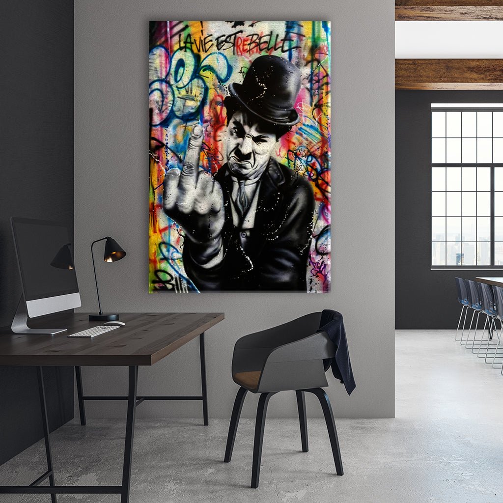 Chaplin gilt als erster Weltstar des Kinos und zählt zu den einflussreichsten Komikern der Filmgeschichte. Auf unserem Bild sieht er jedoch nicht sehr erfreut aus und zeigt uns seinen Mittelfinger. Im Hintergrund eine bunte Graffitiwand auf der oben in französisch der Spruch "Das Leben ist wunderschön" steht.