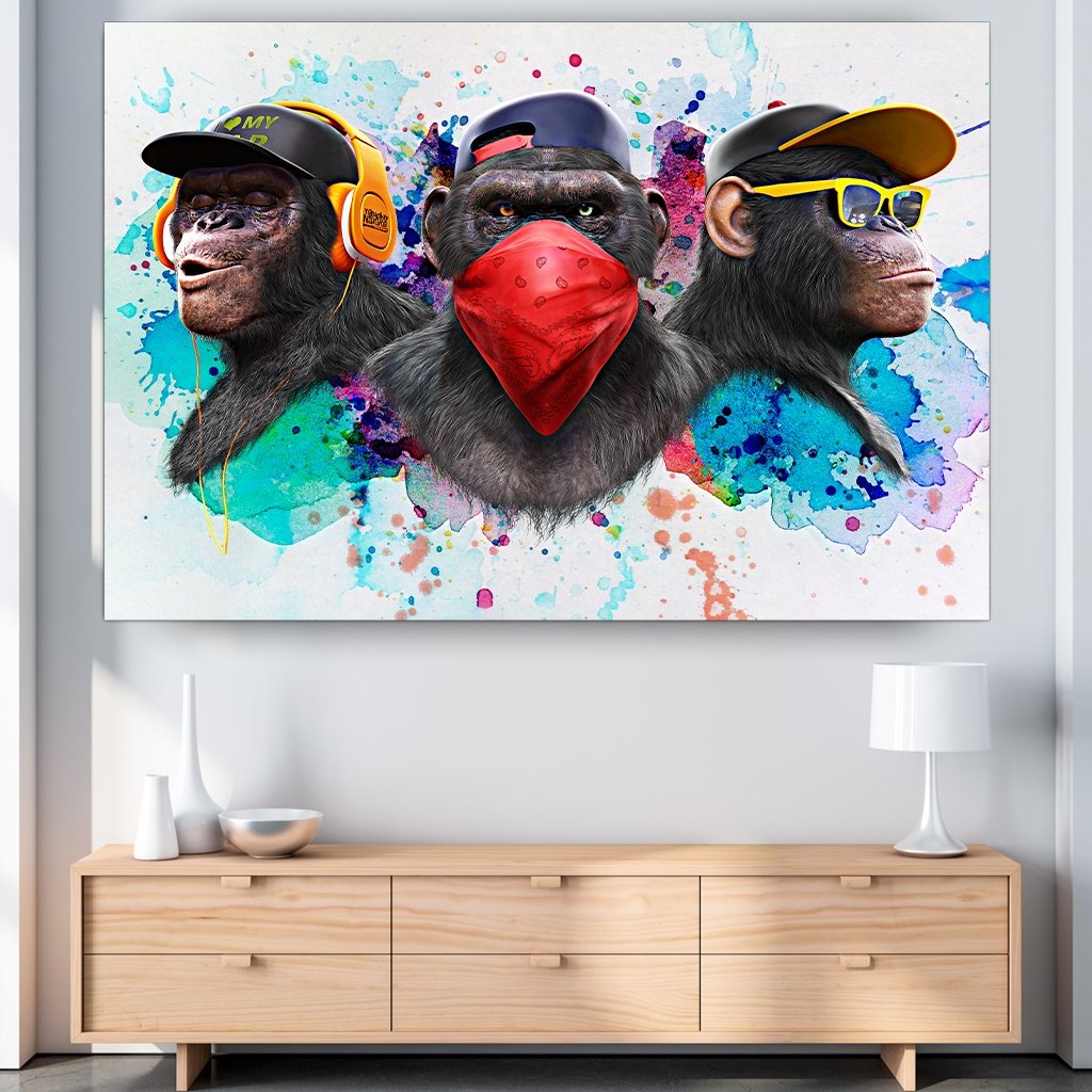 Die Historie des Motiv's mit den 3 Affen kommt ursprünglich aus Japan und bedeutet „nichts sehen, nichts hören, nichts sagen“. Auf dem Motiv findest du links einen Affen "nichts hören" mit einer Baseball Mütze und einem orangenen Kopfhörer. In der Mitte befindet sich der Affe "nichts sagen" mit einem roten Tuch und der rechte Affe "nichts sehen" hat eine gelbe Brille und Baseball Cap auf.