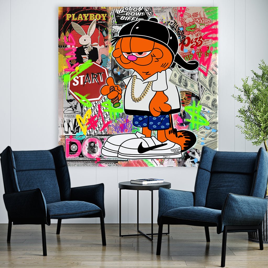 Im Mittelpunkt dieses Motivs steht Garfield, der berühmte Comic-Kater, in einem modernen und urbanen Outfit: eine weiße Hemdjacke, blaue Shorts mit Muster, weiße Sneakers von Nike und eine dicke goldene Kette um den Hals. Er trägt eine schwarze Baseballkappe, die nach hinten gedreht ist, und hat einen lässigen, selbstbewussten Gesichtsausdruck, der durch das Hochhalten seines Daumens noch verstärkt wird.