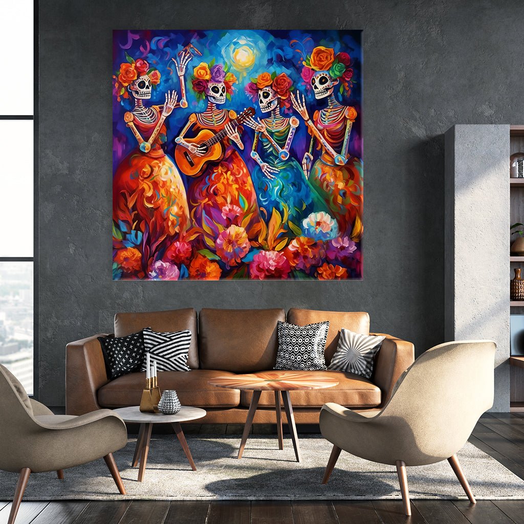 Die lebendige Tradition der "Sugarskulls" und "La Catrina" erstrahlt im charakteristisch bunten mexikanischen Stil. Das Fest der Toten zelebriert das Leben und die Verbindung zu den Verstorbenen. Die fröhlichen Farben und kunstvollen Details dieser Motive ehren die Vergangenheit und erinnern daran, dass der Tod ein Teil des Kreislaufs des Lebens ist. Ein Tribut an die mexikanische Kultur, der in jeder Farbe und Form strahlt.