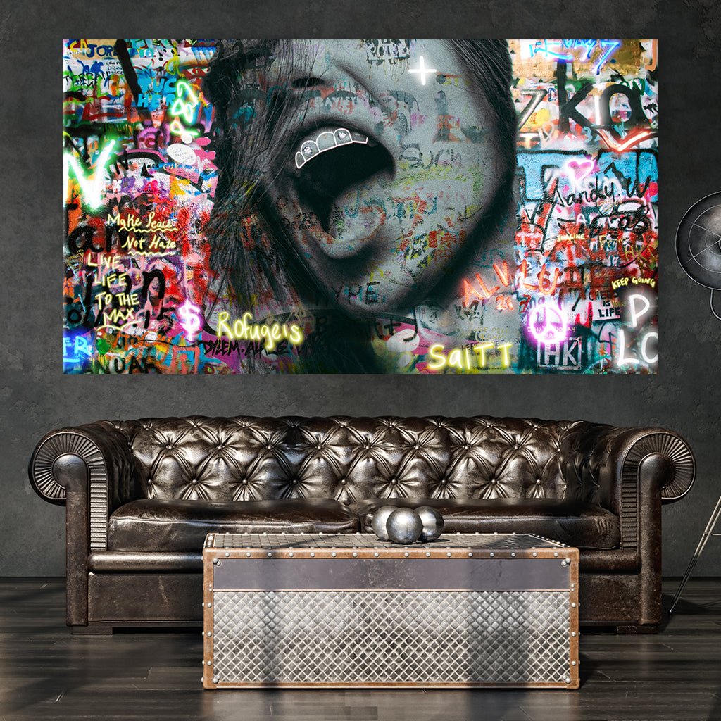 Ein Motiv welches auf den zweiten Blick viel aussagt. Es zeigt ein Frau mit geöffnetem Mund und Diamanten auf den Zähnen auf einer Graffitiwand. Darauf sind Worte wie zum Beispiel "Flüchtlinge" zu sehen und geben dadurch viel Spielraum bei der Meinungsbildung zu dem Motiv.