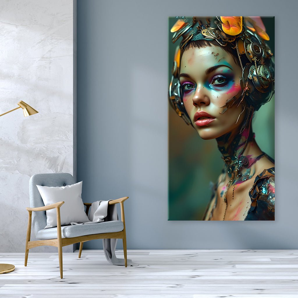 Das Bild zeigt eine futuristische, kybernetische Frau mit einem kunstvollen Kopfschmuck aus mechanischen Elementen und metallischen Details. Ihre Haut ist mit leuchtenden Farben bemalt, die ihr ein avantgardistisches, fast künstliches Aussehen verleihen. Die Kombination aus organischer Schönheit und technologischen Komponenten verleiht dem Motiv eine Cyberpunk-Ästhetik mit künstlerischer Raffinesse.