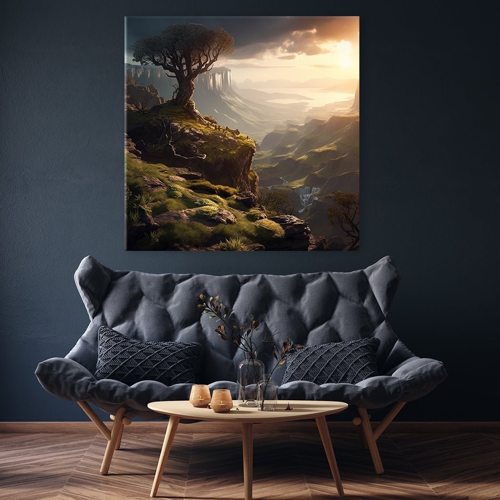 Ein einsamer Baum steht auf dem Klippenhang im Sonnenaufgang, umgeben von einer märchenhaften Landschaft. Saftiges Grün umrahmt den majestätischen Anblick. In der Ferne breitet sich das See aus, ein geheimnisvoller Spiegel für die Fantasie. Diese Szene entführt in eine Welt, wie sie aus einem Fantasyfilm entsprungen sein könnte.