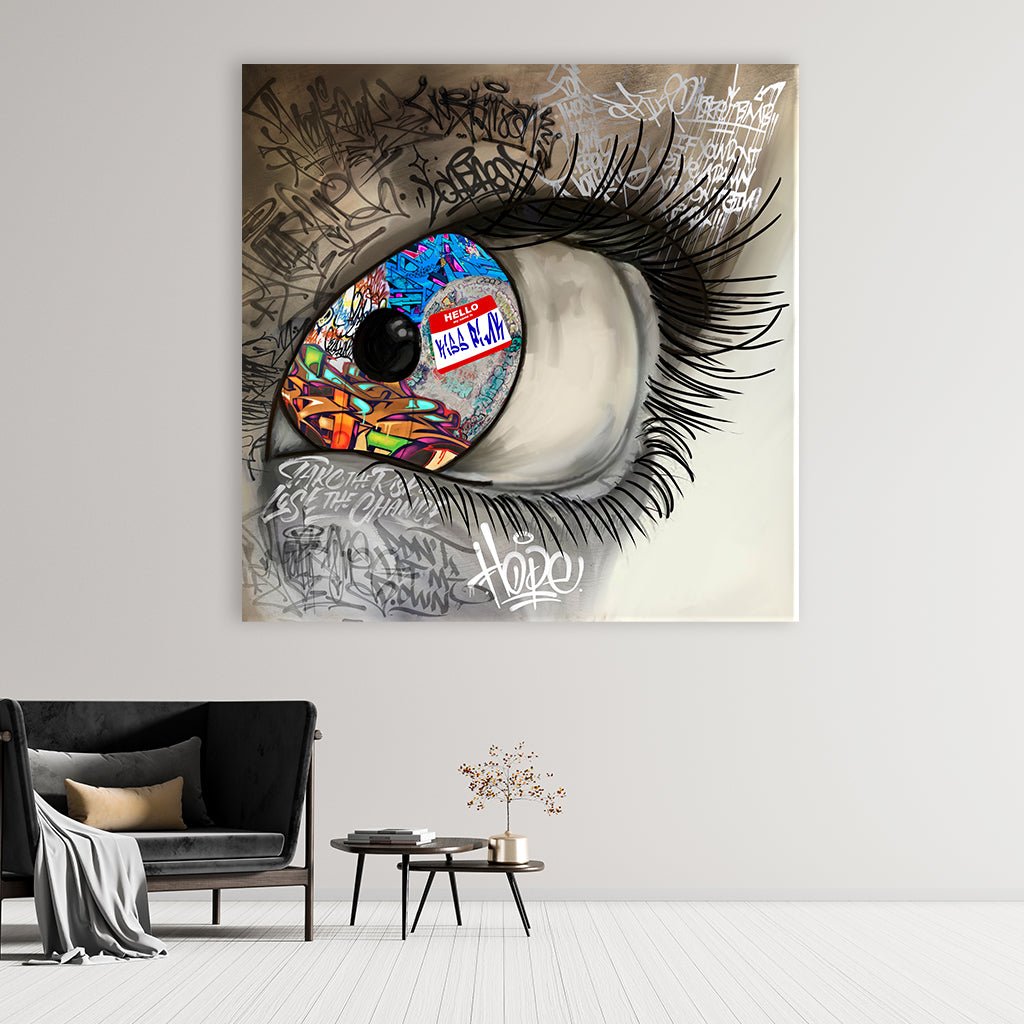 Ein faszinierendes Kunstwerk im Stil des Graffiti zeigt das Auge als Mittelpunkt. Die Iris, kunstvoll gestaltet im Streetart-Stil, vermittelt die Sichtweise eines Grafikers auf die Welt. Es symbolisiert die Art und Weise, wie ein Künstler seine Umgebung einfängt und interpretiert. Die bunten Elemente und die dynamische Gestaltung spiegeln die Kreativität und Vielfalt wider, die in der Welt der Kunst vorhanden sind.