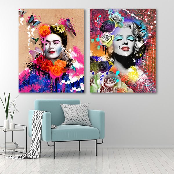 Berühmte Frauen zieren diese beiden außergewöhnlichen Motive. Frida Kahlo und Marilyn Monroe in bunten Farben und einem Meer aus Blumen in Szene gesetzt. Dieser moderne Stil ist ein absoluter Blickfang für jeden Raum. Egal ob im Wohnzimmer, Schlafzimmer oder Studierzimmer.
