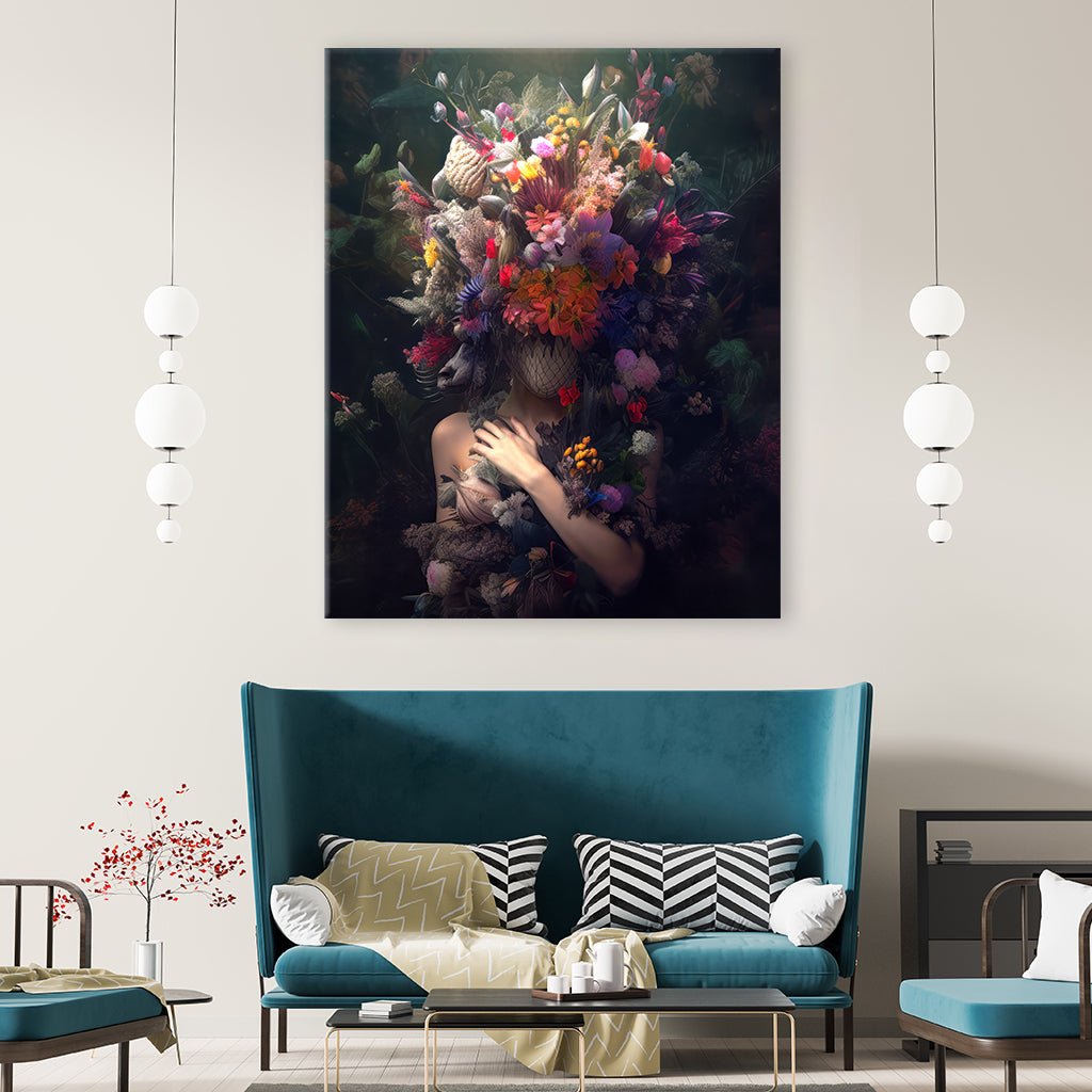 Ein farbenprächtiges Blumenmeer, dezent bunt und farblich im altertümlichen Stil, umgibt eine Frau im Mittelpunkt des Bildes. Sie ist von Kopf bis Fuß mit Blumen geschmückt, sodass nur ihr Arm und eine Schulter zu erkennen sind. Dieses Kunstwerk zeigt die Vielfalt und Schönheit der Natur und strahlt eine gewisse Eleganz aus.