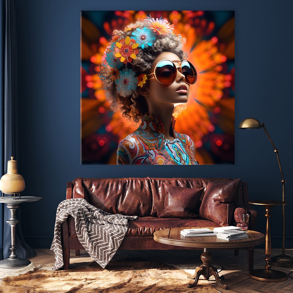 Diese Fotografie zeigt eine Frau im Flower Power Stil, mit einer großen Retro-Sonnenbrille und bunten Blumen im Haar. Der faszinierende Hintergrund unterstreicht das nostalgische Flair. Die lebendigen Farben und psychedelischen Muster lassen die Betrachter in eine Zeit der Freiheit und Liebe eintauchen.