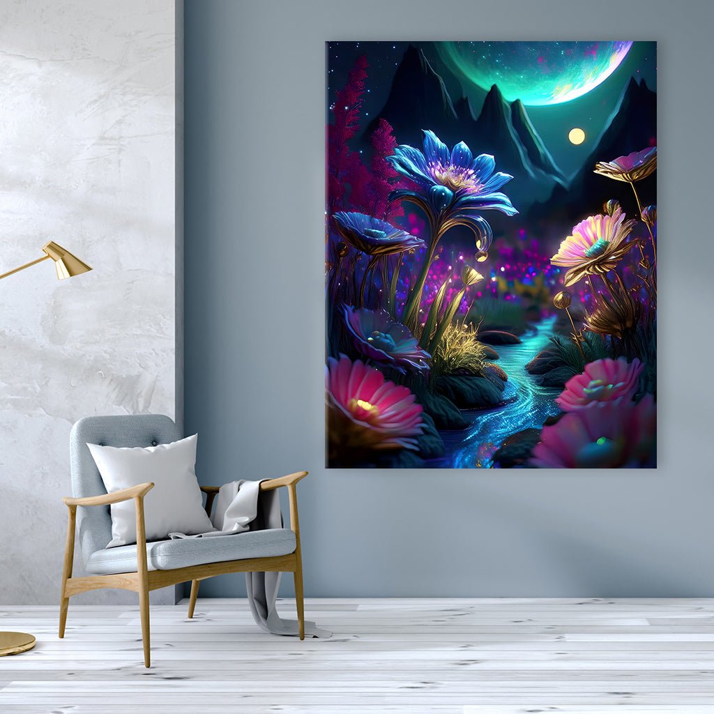 Dieses surreale Bild zeigt eine galaktische Landschaft voller leuchtender Blumen und einem kleinen Bach, der durch die Szene fließt. Im Hintergrund erheben sich dunkle Berge vor einem fantastischen Himmel mit einem riesigen, leuchtenden Planeten und einem kleinen Mond. Die Blumen im Vordergrund leuchten in verschiedenen Farben und werfen ein sanftes Licht auf die Umgebung.