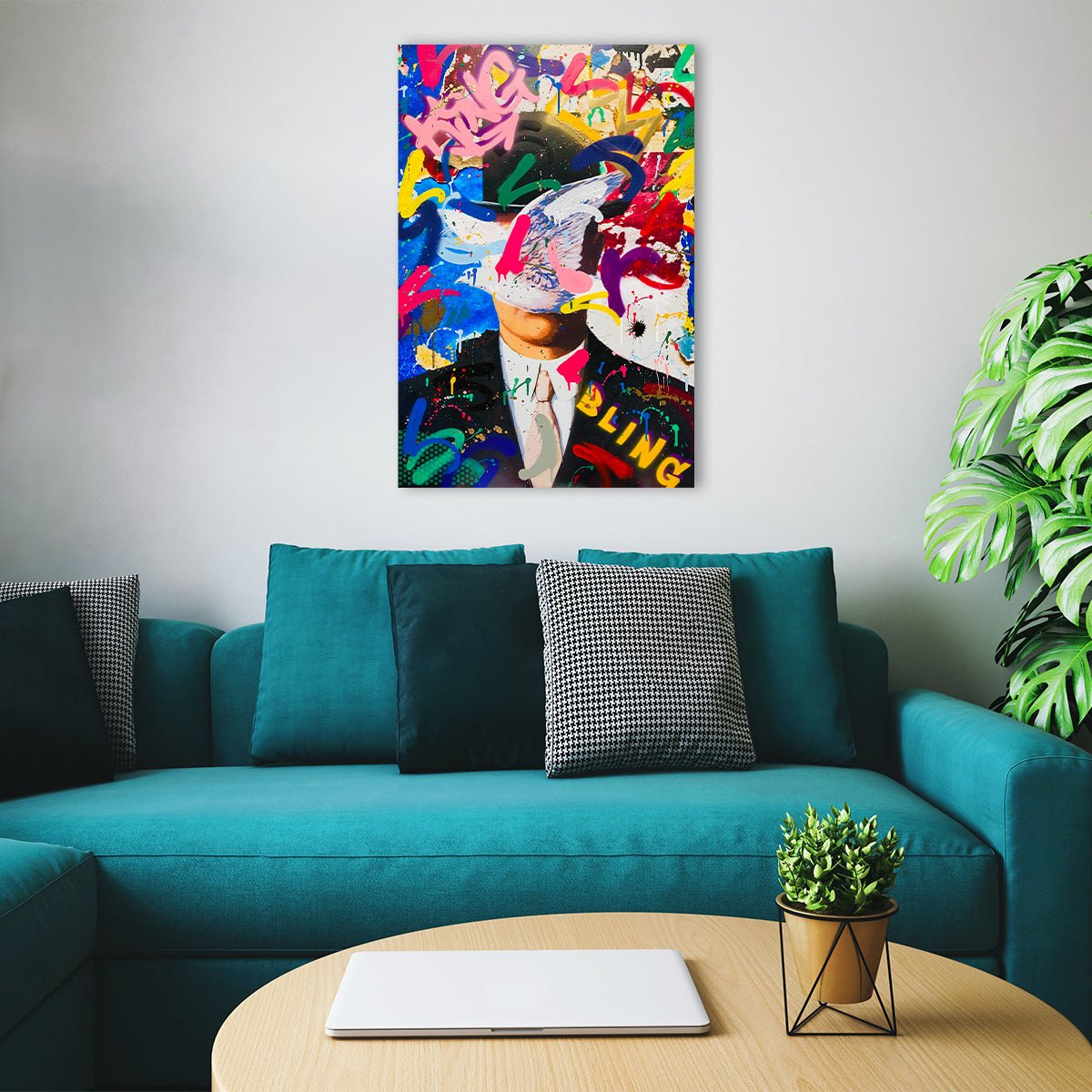 Unser Motiv zeigt eines der bekanntesten Motive des Künstlers René Magritte, dessen Bilder mit dem Denken und der Wahrnehmungsfähigkeit des Betrachters spielt. Abstrakt umgestaltet mit bunten Farben und Graffiti und einer Taube als Mittelpunkt ist ein neuer farbenfroher Stil entstanden und somit ein besonderer Eyecatcher in jedem Raum. Ganz egal ob an der Bilderwand im Wohnzimmer, Schlafzimmer oder Flur.
