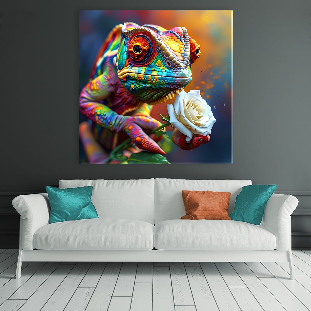 Das Bild zeigt ein Chamäleon mit einem bunten, fast psychedelischen Farbmuster, das eine weiße Rose in seinen Krallen hält. Das Chamäleon hat große, ausdrucksstarke Augen und seine Haut ist mit einer Vielzahl von Farben und Mustern bedeckt. Die Rose ist weiß und hat eine zarte Textur.