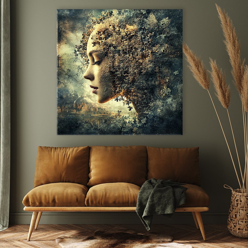 Dieses kunstvolles Porträt einer Frau, deren Gesicht und Haare sich in Puzzleteile auflösen, wie eine auflösende Identität, Gedanken oder Erinnerungen oder sich neu zusammensetzen. Im Hintergrund des Motivs ist ein herrschaftliches Anwesen zu sehen.