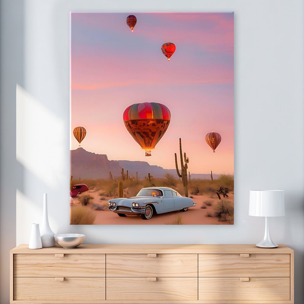 Ein hellblauer Oldtimer steht einsam in der Weite einer sonnendurchfluteten Wüste. Umgeben von Kakteen und trockenen Büschen, strahlt das klassische Auto einen charmanten Kontrast zur kargen Umgebung aus. Im Hintergrund erheben sich majestätische Berglandschaften, die der Szene Tiefe und Perspektive verleihen. Am Himmel schweben sanft mehrere Heißluftballons, die ein farbenfrohes und träumerisches Element hinzufügen. Die gesamte Szenerie kombiniert Vintage-Charme mit einer weiten, offenen Wüstenlandschaft und einem Hauch von Abenteuer.