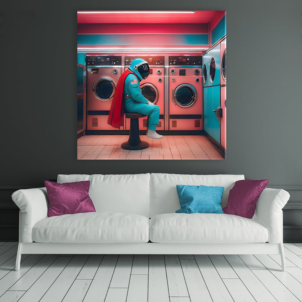 In einem surrealen Szenario sitzt ein Astronaut in einem blauen Raumanzug mit einem markanten roten Heldencape in einer typisch amerikanischen Wäscherei. Er starrt gedankenverloren auf die Reihe von rosa und blauen Waschautomaten vor ihm. Der Raum ist in ein sanftes, rosa Licht getaucht, das von einer leuchtenden Leuchtstoffröhre über ihm ausgeht und die Szenerie in eine verträumte, fast melancholische Stimmung hüllt.