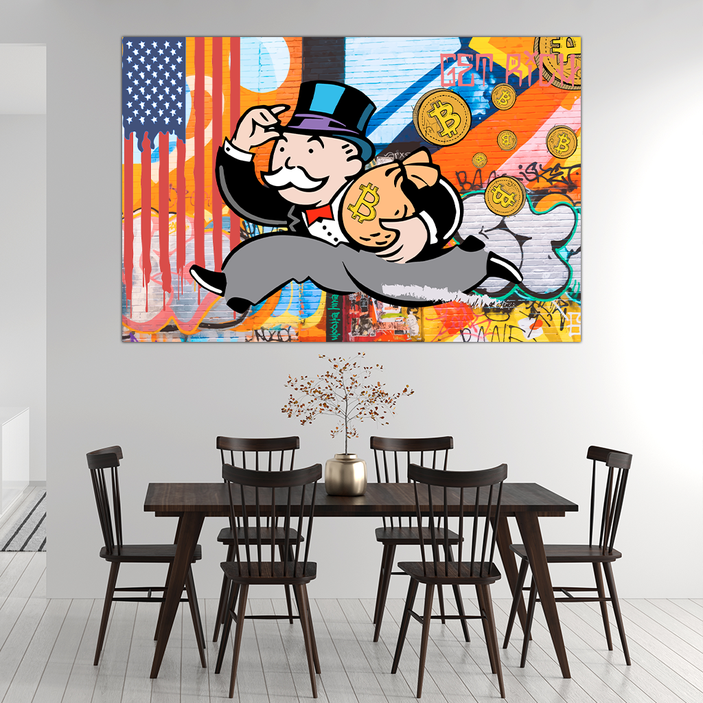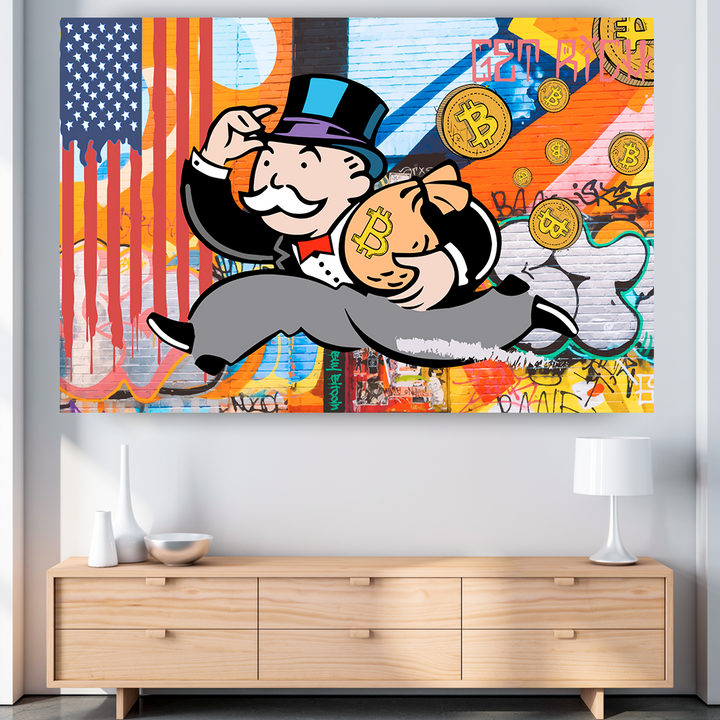 Ein kurioses Bild: Das Monopoly-Männchen eilt mit einem Sack voll Bitcoins unter dem Arm davon. Hinter ihm erstreckt sich eine lebendige Graffiti-Kulisse, die den urbanen Charakter betont und die amerikanische Flagge zeigt.
