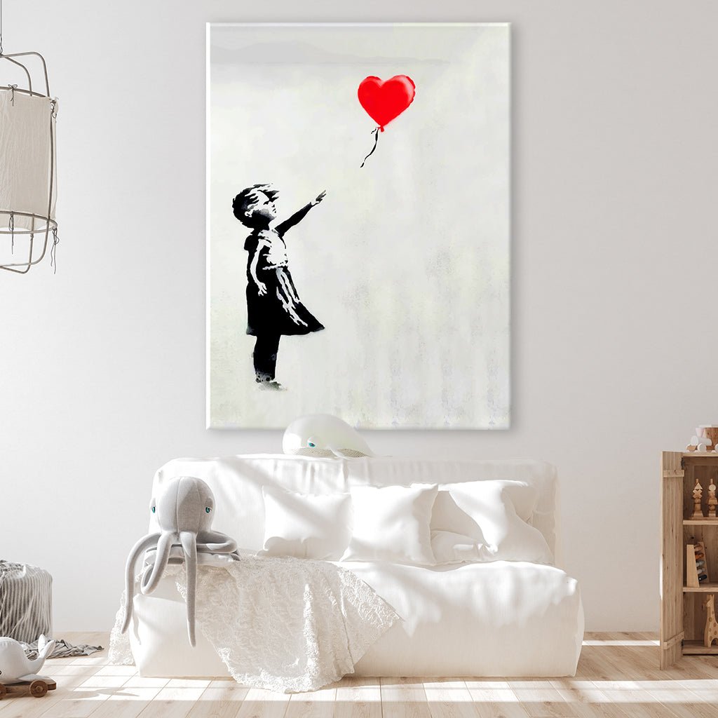 Dieses bekannte Banksy Werk zeigt ein Mädchen dessen Arm auf einen roten herzförmigen Balloon gerichtet ist der ihr vermutlich gerade aus der Hand geglitten ist. Die Interpretation dieses Street Art Kunstwerks will uns aufzeigen, dass man immer an der Liebe festhalten soll, auch wenn es stürmische Zeiten geben kann.