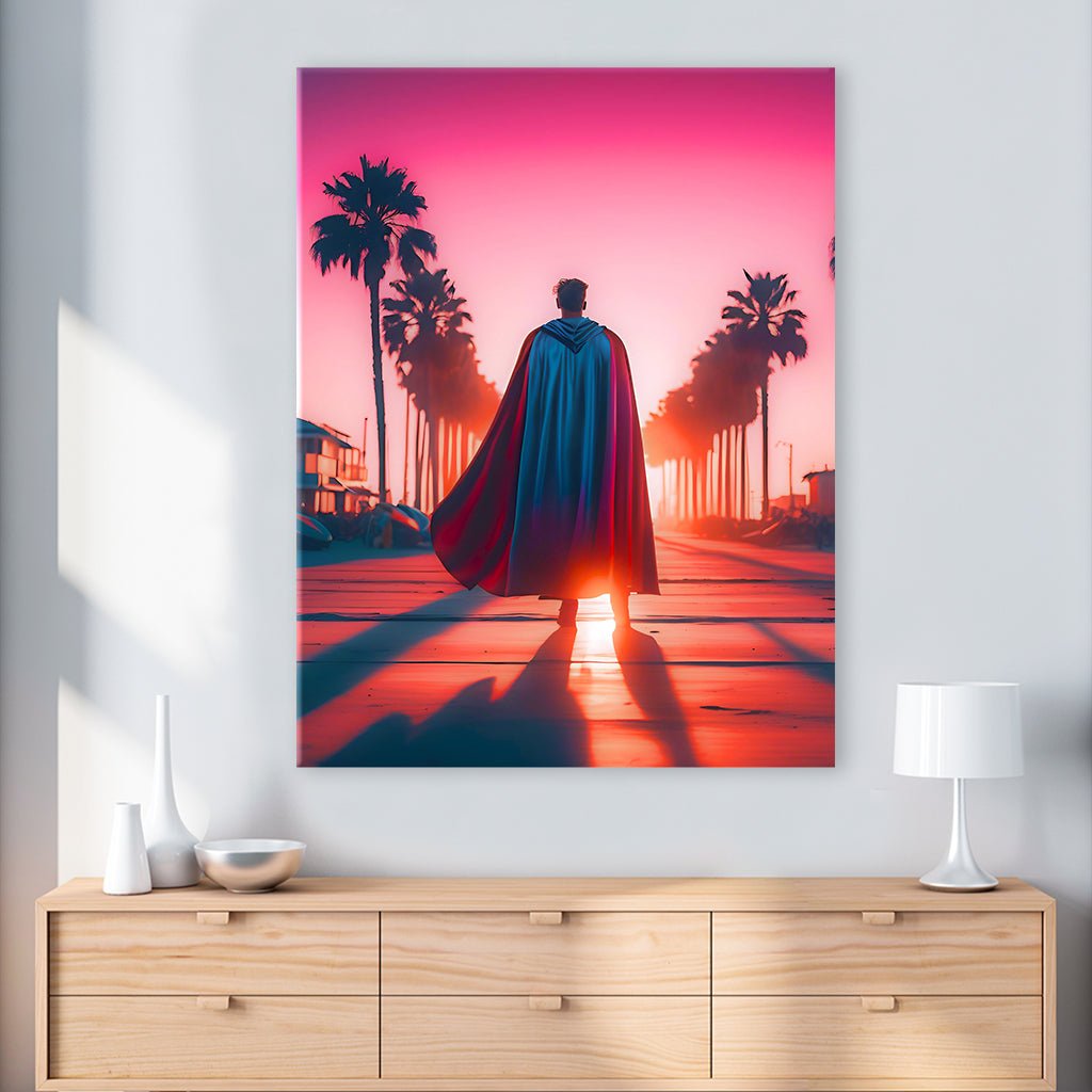 Ein Superheld schreitet dem Sonnenaufgang entgegen, seine Silhouette kraftvoll und entschlossen gegen die beeindruckende Kulisse des frühen Morgens. Am Wegesrand reihen sich elegante Palmen im sanften Licht der aufgehenden Sonne. Der Himmel ist in ein spektakuläres Farbenspiel aus Pink und Rot getaucht, das sanft in einen warmen Farbverlauf übergeht und die Szene in ein faszinierendes, energetisches Licht hüllt.