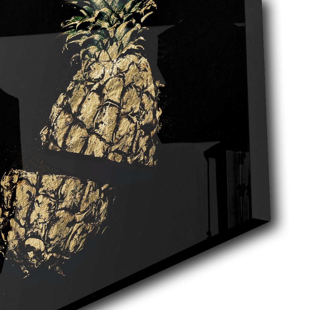 "Golden Anna" ist ein quadratisches Kunstwerk im Gold-Schwarz-Stil, das aus einer exotischen Frucht besteht, nämlich einer zerteilten Ananas.Der Hintergrund ist schwarz und das Bild wird durch echtes Blattgold von Hand verziert.