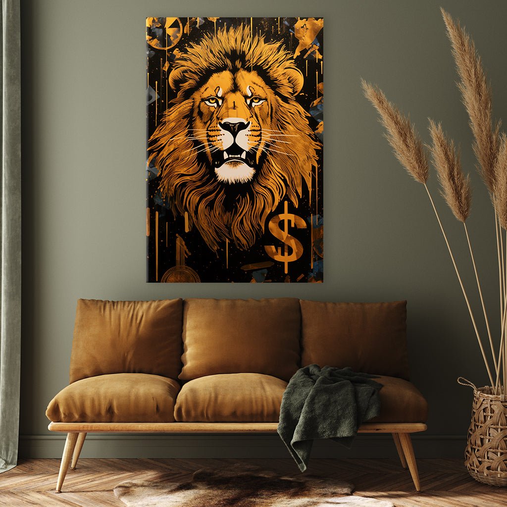 Ein ausdrucksstarker Löwe mit einer prächtigen Mähne und leicht geöffnetem Maul im Streetart Stil. Die Farbgestaltung beschränkt sich auf die Farben Schwarz und Braun-Orange wodurch das Bild ruhig und modern wirkt.