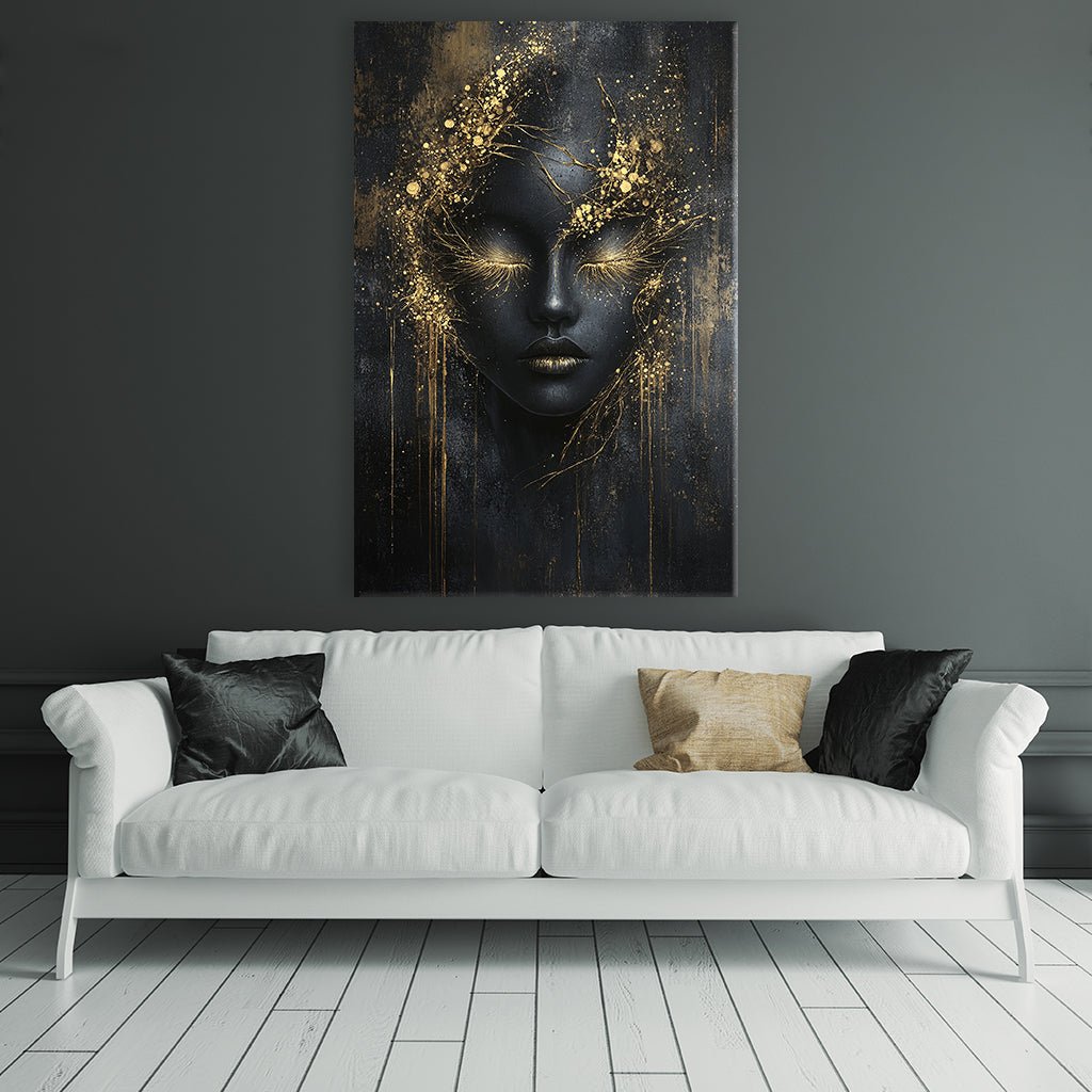 Dieses fesselnde Bild zeigt eine mysteriöse, dunkle Frau, deren Gesicht mit goldenen Akzenten geschmückt ist. Ihr Blick ist gesenkt, ihre Augen geschlossen, was ein Gefühl von Frieden und Ruhe hervorruft. Die Farbpalette ist dunkel und stimmungsvoll, wobei Schwarz- und Gold dominieren. Die goldenen Akzente verleihen dem Bild einen Hauch von Opulenz und Dramatik.