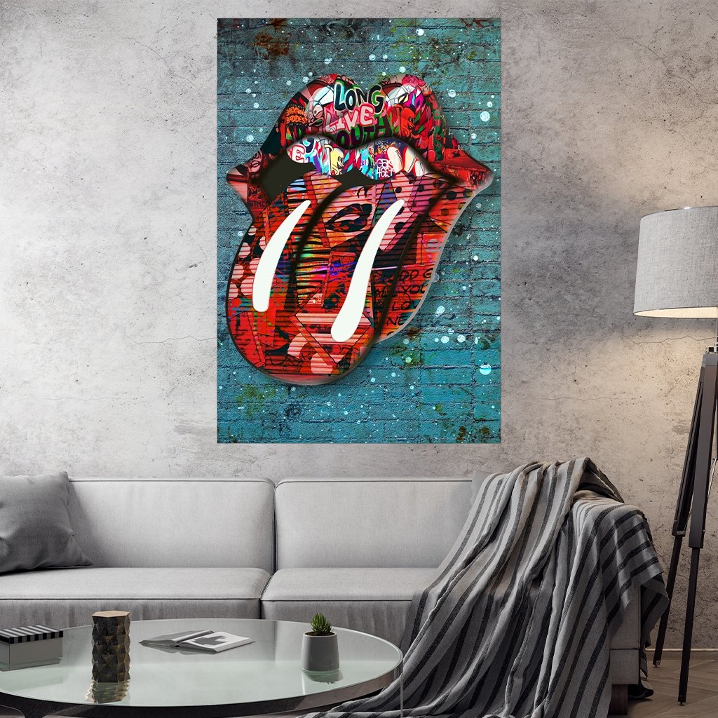 Das Bild zeigt eine herausgestreckte Zunge im Graffiti-Stil auf einer Mauer. Der rote Mund hebt sich deutlich vom grün der Mauer ab und ist ein toller Blickfang für dein Wände im Wohnzimmer, Flur, Büro oder Schlafzimmer.