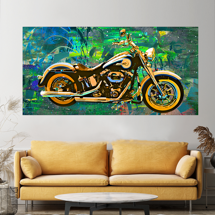 Kaum ein Mensch kann seinen Blick von einer heißen Maschine abwenden und wenn es dann auch noch eine Harley ist ist man oft in ihrem Bann. Ganz egal ob nostalgisches oder modernes Modell. Die Harley in unserem Motiv wurde abstrakt in Szene gesetzt. Auf einem grünen aquarellähnlichem Hintergrund sticht die in Gold und Schwarz schimmernde Harley ins Auge und ist somit ein toller Blickfang für die Wand in deiner Wohnung.