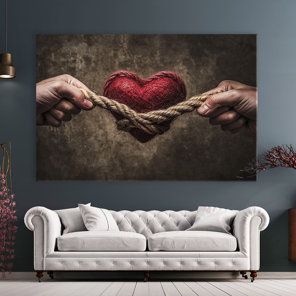 Dieses eindrucksvolle Bild fängt einen Moment des Kampfes und der Spannung ein. Ein rotes Herz aus Textil, das mit Seilen umschlungen ist, wird von zwei Händen in verschiedene Richtungen gezogen. Der Hintergrund ist eine dunkle, neutrale Farbe, die es dem Herzen und den Händen ermöglicht, sich abzuheben. Dieses Bild ist eine kraftvolle Metapher für die Komplexität von Beziehungen und die Kämpfe, die wir bei der Liebe ertragen.