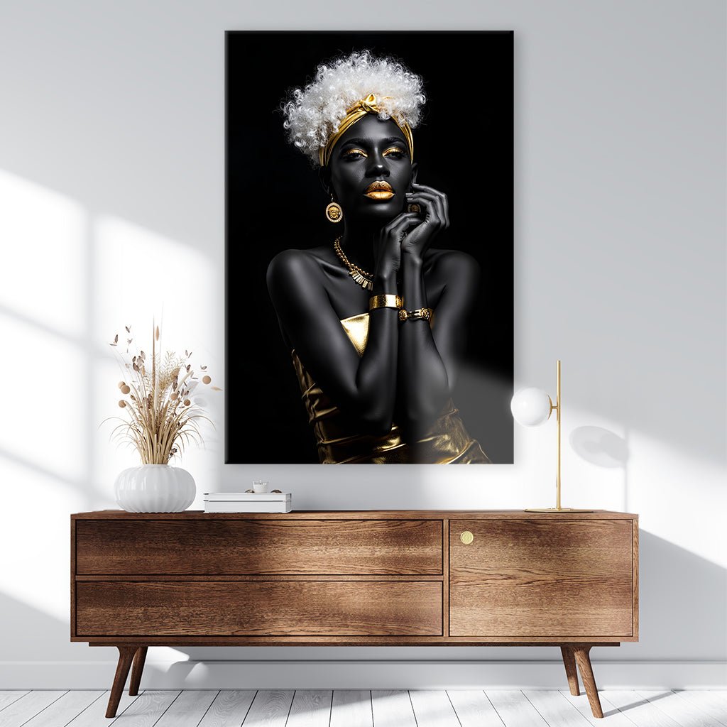 Dieses auffällige Bild zeigt eine Frau mit dunkler Haut und einem weißen Kurzhaarschnitt. Ihr Gesicht ist mit goldenen Akzenten geschmückt, die ihre Augen und Lippen betonen. Sie trägt eine Vielzahl von goldenen Schmuckstücken, ein goldenes Haarband und Oberteil. Der Hintergrund ist dunkel, wodurch die Frau und ihre goldenen Akzente noch mehr hervorstechen. Das Bild spielt mit Kontrasten und Texturen, um eine fesselnde und luxuriöse Atmosphäre zu schaffen.