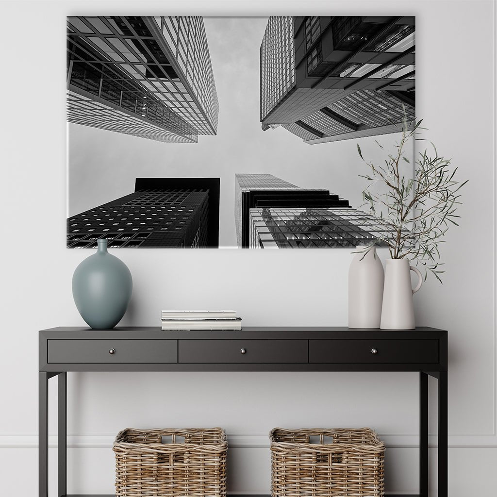 Dieses Bild zeigt wie beeindruckend diese riesigen Gebäude auf der Froschperspektive wirken und in Schwarz-Weiß gehalten passt es in jeden Raum und zu jedem modernen Einrichtungsstil.
