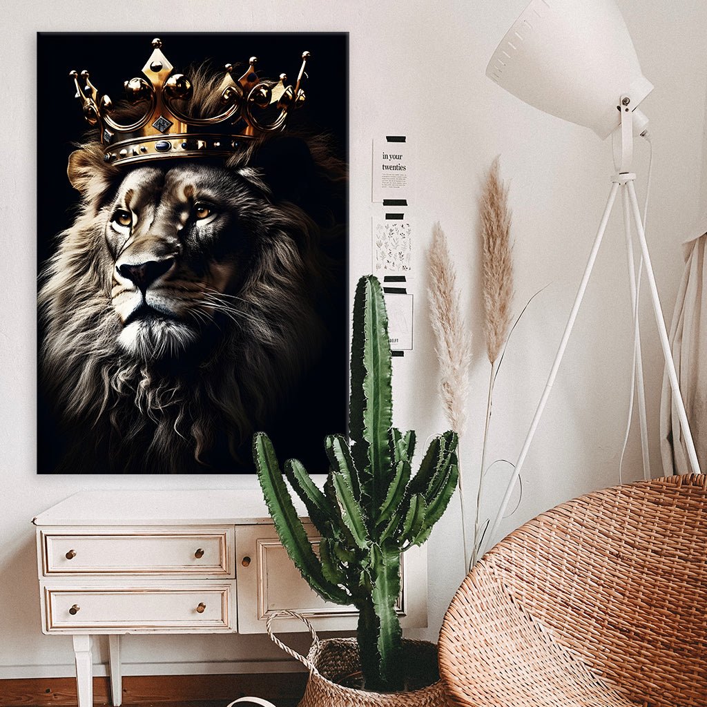 Ein majestätischer Löwe wird in beeindruckender Nahaufnahme dargestellt, mit einer imposanten Krone, die auf seinem Kopf thront. Die faszinierende Lichtgestaltung betont die königliche Aura des Motivs. Dieses atemberaubende Kunstwerk wird zum Blickfang in jedem Wohnzimmer, Schlafzimmer oder Flur. Lassen Sie sich von diesem fesselnden Werk verzaubern und bringen Sie die Anmut und Eleganz des Löwenkönigs in Ihr Zuhause.