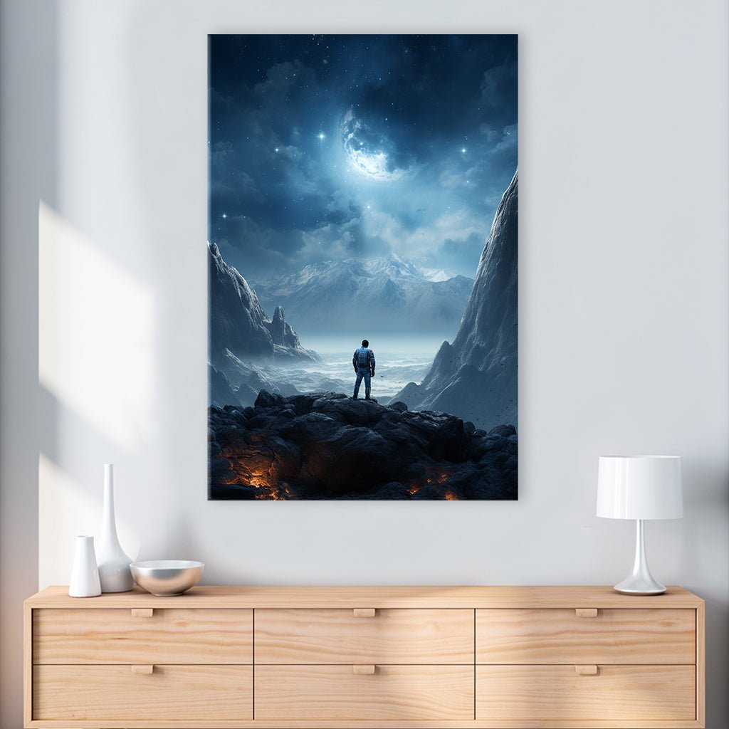 Ein Wanderer steht nachts auf einem einsamen Berggipfel. Die Dunkelheit umgibt ihn, nur durchbrochen von den Lichtern der Sterne. Der Mond kämpft sich durch die dichten Wolken und taucht die Bergwelt in ein schwaches silbernes Licht. Die Gipfel erheben sich majestätisch, als ob sie den Himmel berühren wollten. Eine Atmosphäre der Stille und Erhabenheit, während er in die Ferne blickt und die Geheimnisse der Nacht zu ergründen versucht.