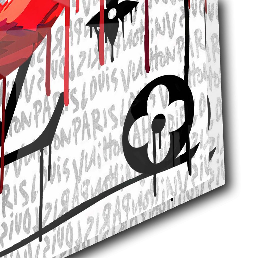 In diesem künstlerischen Motiv dominieren kräftig rote Damenlippen, die verführerisch auf die Unterlippe beißen. Ein weißer Hintergrund setzt die Lippen in den Fokus, während silberne Louis Vuitton Logos im Graffitistil kunstvoll integriert sind.