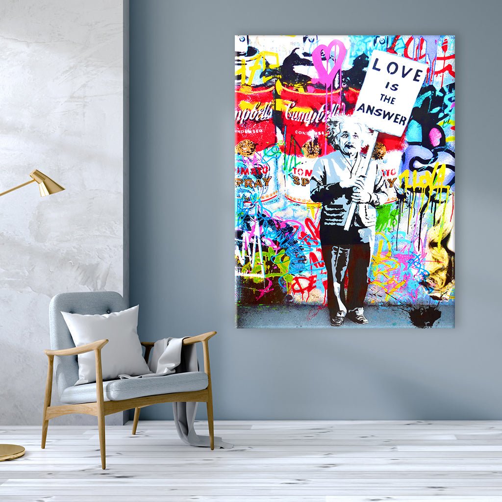 Das Graffitibild zeigt Albert Einstein in einer charakteristischen Pose mit einem Schild in der Hand. Auf dem Schild steht in großen Buchstaben "Love is the answer" geschrieben. Im Hintergrund des Bildes ist eine knallig bunte Graffitiwand zu sehen. Es vermittelt eine wichtige Botschaft über Liebe und Frieden miteinander.