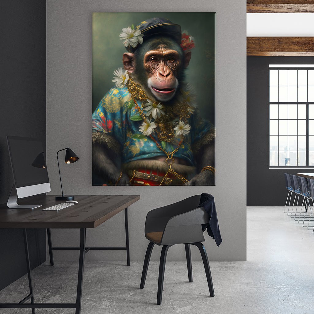 Dieser Affe ist wie ein wohlhabender Tourist gekleidet und trägt ein lässiges Hawaiihemd mit bunten Blumen. Sein Arm und Hals sind mit funkelndem Goldschmuck geschmückt und er trägt auch weiße Blüten als Accessoires.