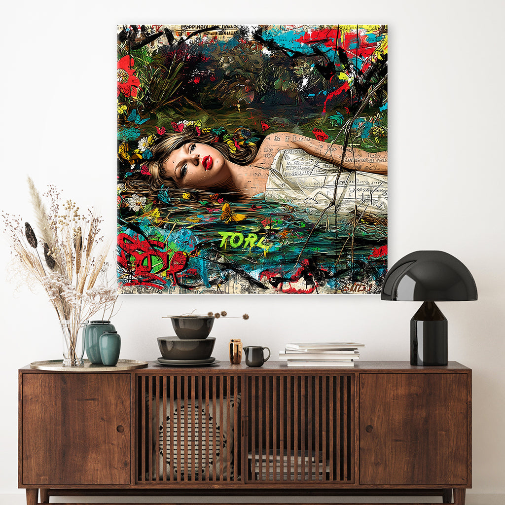 Diese moderne „Ophelia“-Interpretation verbindet klassische Melancholie mit einer dynamischen Street-Art-Ästhetik, indem sie die fotorealistische Darstellung der Sängerin Taylor Swift als Ophelia mit Zeitungsdruck-Overlays und leuchtenden Graffiti-Tags kombiniert. Eingebettet in ein chaotisches Umfeld aus Neon-Farbspritzern und abstrakter Natur entsteht so ein kraftvolles Mixed-Media-Werk.