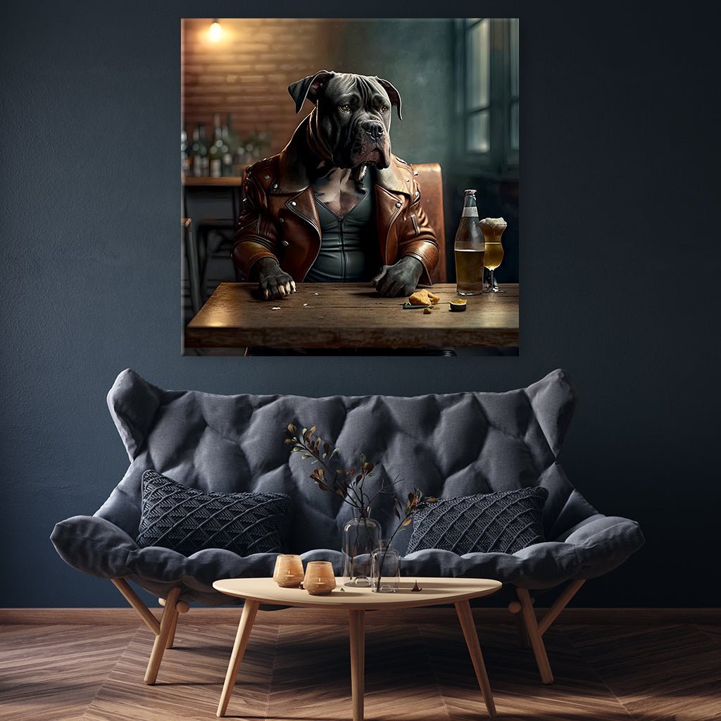 In einer tierischen Bar sitzt ein schwarzer Cane Corso in einer coolen Lederjacke an einem Tisch und genießt ein Glas Bier. Die stimmungsvolle Lichtgestaltung unterstreicht die Atmosphäre dieser ungewöhnlichen Szene. Ein ausgefallenes Motiv, das den außergewöhnlichen Barbesuch eines tierischen Gastes im typischen Charme einer Bar in dein Zimmer bringt.
