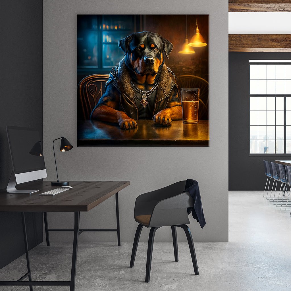 In einer tierischen Bar sitzt ein starker Rottweiler bekleidet mit einer Lederjacke und großer Gliederhalskette am Tisch und genießt ein Bier. Die stimmungsvolle Lichtgestaltung unterstreicht die Atmosphäre dieser ungewöhnlichen Szene. Ein ausgefallenes Motiv, das den außergewöhnlichen Barbesuch eines tierischen Gastes im typischen Charme einer Bar in dein Zimmer bringt.
