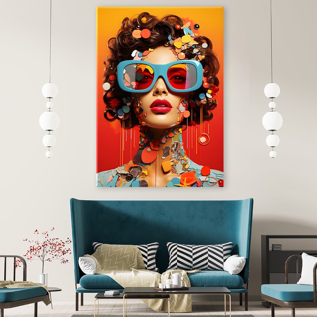 Im 60er Jahre Popart Stil präsentiert sich eine Frau mit üppiger Lockenmähne und einer großen Sonnenbrille. Der orange-rote Hintergrund verleiht dem Bild eine lebendige und dynamische Atmosphäre. Dieses fesselnde Kunstwerk wird zum Blickfang in Wohnzimmer, Schlafzimmer oder Flur. Die Kombination aus dem nostalgischen Flair der 60er Jahre und den kräftigen Farben schafft eine faszinierende Verbindung.