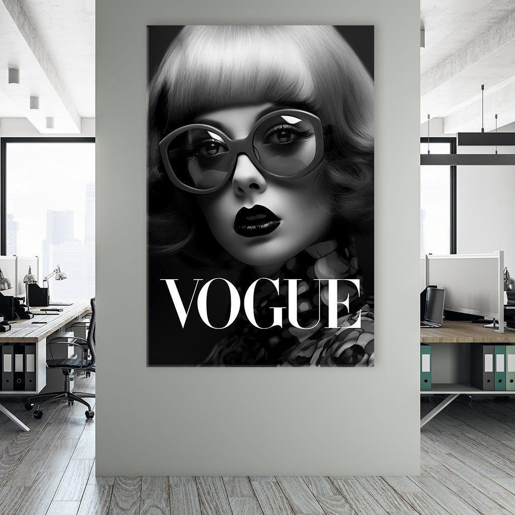 In diesem beeindruckenden Motiv im Retrostil zeigt sich eine Dame mit großer Retro Sonnenbrille und schwarzen Lippen. Im mittleren Bildbereich prangt der große Schriftzug "VOGUE".
