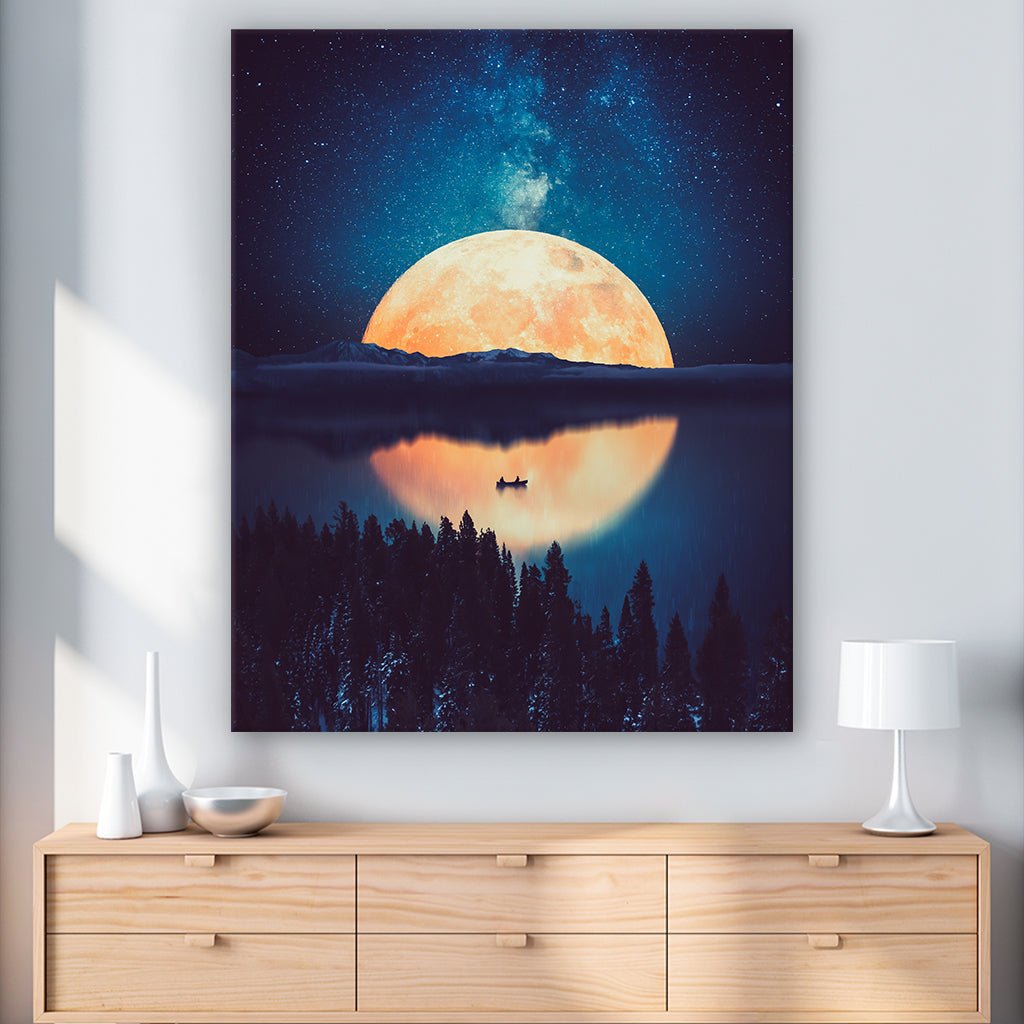 Ein einsames Boot Nachts in mitten eines See umgeben von Bergen und Wäldern. Der Mond ragt riesig hinter den Bergen empor und erleuchtet die Nacht.