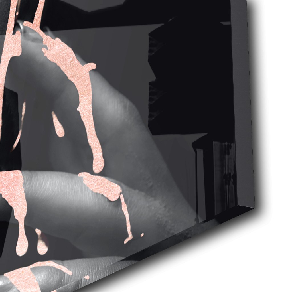 Das Motiv "Rosé Lips Rosé auf Acryl" ist ein atemberaubendes Kunstwerk, das auf Acryl gefertigt und mit Roségold veredelt wurde. Es zeigt eine Nahaufnahme des Gesichts einer Frau, die ihre Hand an ihre Wange hält. Der Fokus liegt auf ihren Lippen, die durch die silberne Farbe hervorgehoben werden und einen anzüglichen Ausdruck vermitteln.