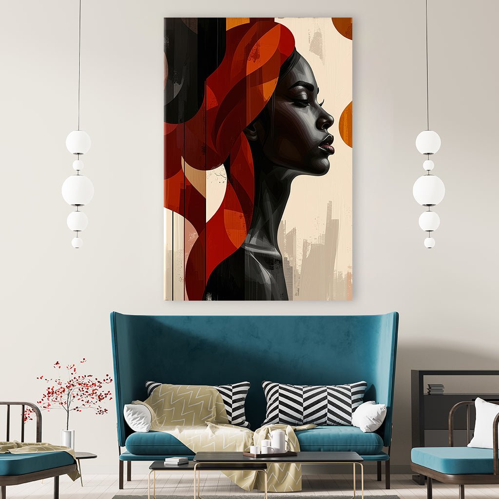 Dieses ausdrucksstarke Bild zeigt das Profil einer Frau, das in einem modernen, fast geometrischen Stil dargestellt ist. Ihr Gesicht ist detailreich gezeichnet, mit markanten Wimpern und Lippen, während ihr Haar und der Hintergrund aus abstrakten, überlappenden Formen in warmen Rot-, Orange- und Brauntönen bestehen. Die Kombination aus realistischen und abstrakten Elementen schafft eine interessante Spannung und verleiht dem Bild eine zeitgenössische Ästhetik.