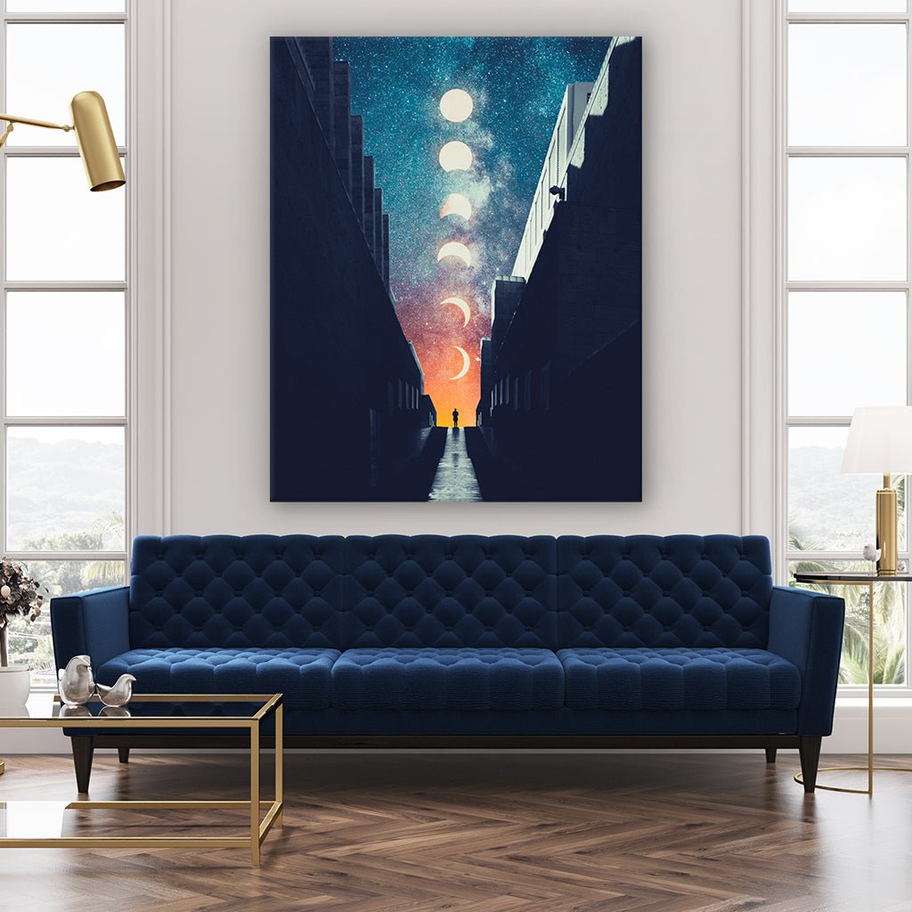 Wandeln durch die Nacht und dabei allein mit sich selbst. Die verschiedenen Mondphasen am Sternenhimmel welche man zwischen der Straßengasse erblickt lässt einen mit seinen Blicken auf dem Motiv verweilen. Der perfekte Blickfang für dein Wohnzimmer, Flur oder Büro.