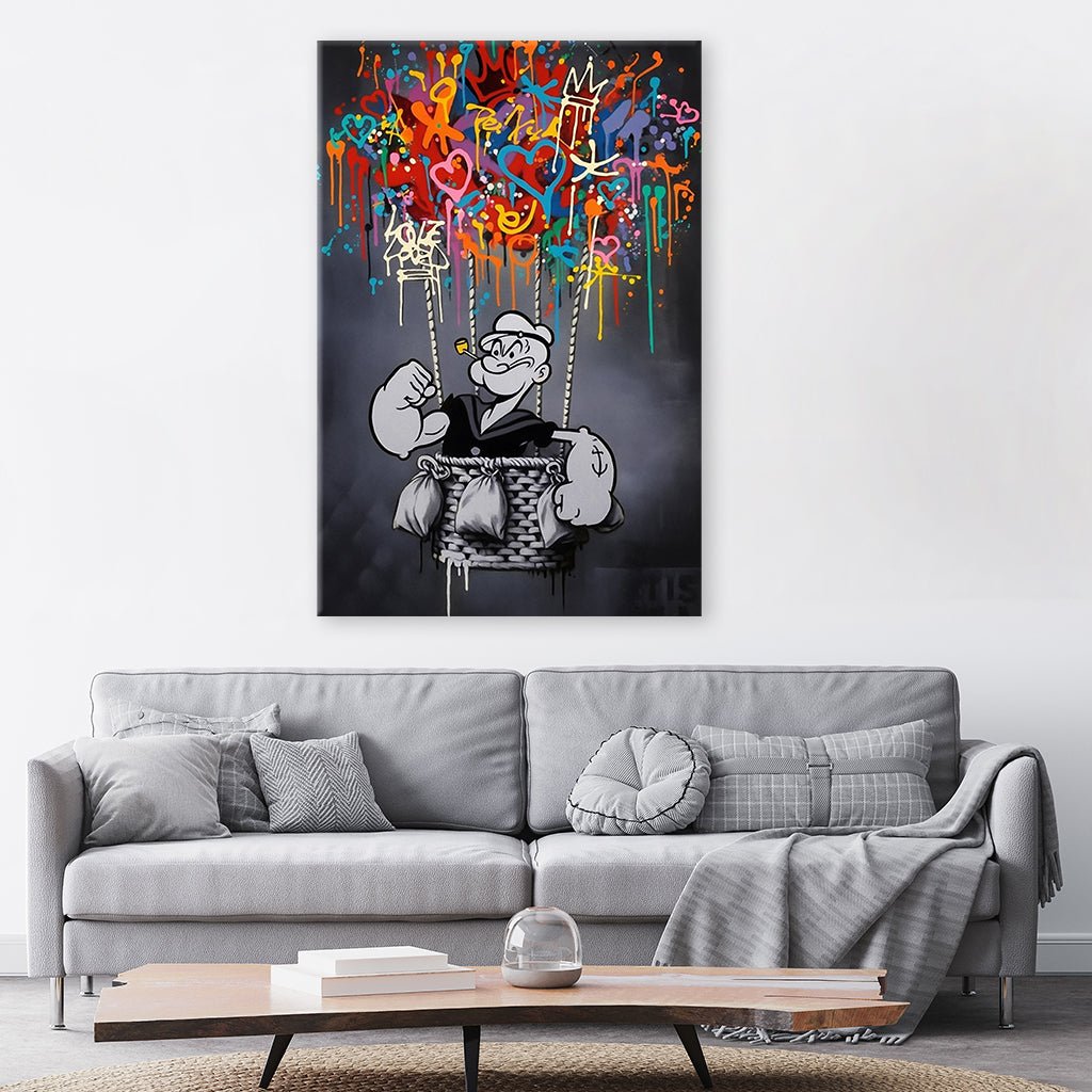 Dieses Motiv zeigt Popeye in Schwarz-Weiß wie er einem grauen Heißluftballonkorb steht. Der Ballon selbst besteht aus bunten Graffitielementen, die das Bild sehr energisch und künstlerisch wirken lassen.