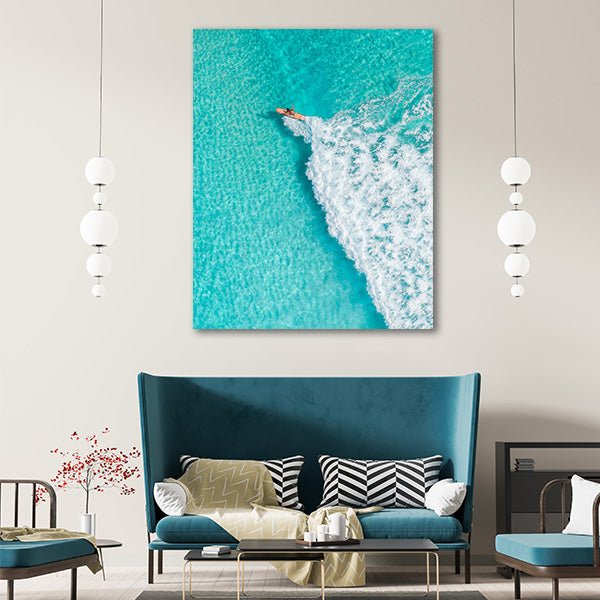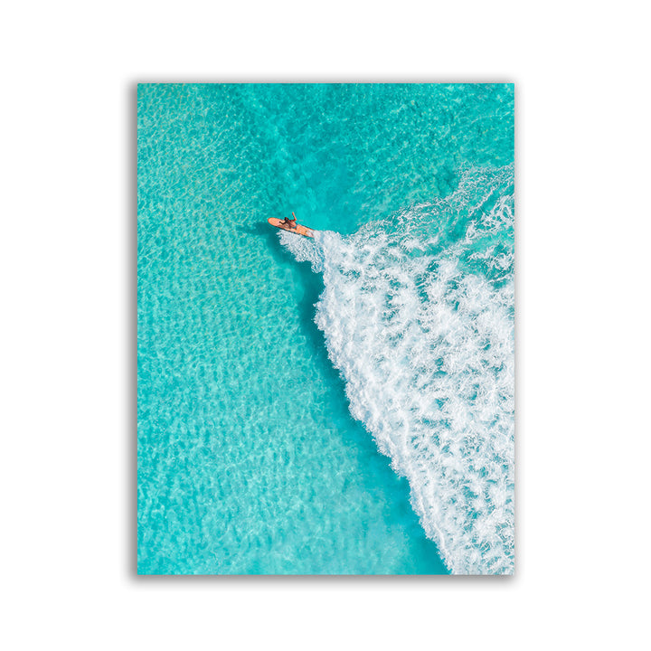 Ein Surfer auf seinem Surfbrett reitet auf den Wellen des türkisblauen Meeres. Von oben betrachtet zeigt dieses Motiv diese fantastische Sport- und Freizeitgestaltung aus einer ganz anderen Perspektive. Dieses Motiv ist perfekt für dein modern eingerichtetes Wohnzimmer, Büro oder Loftwohnung.